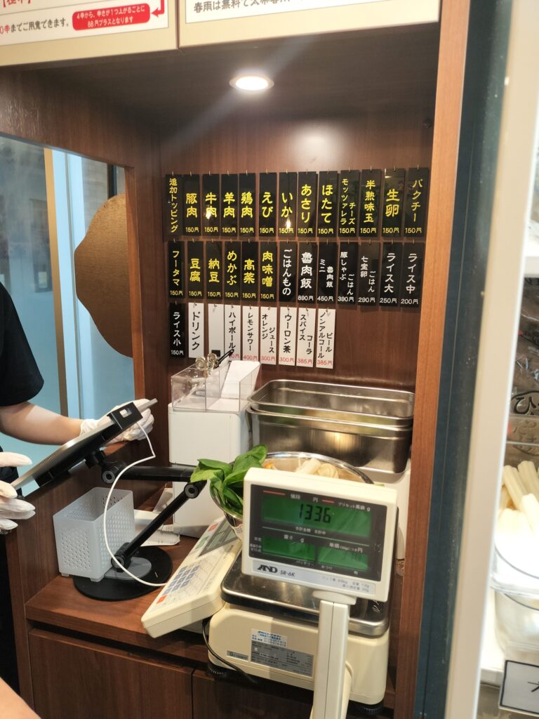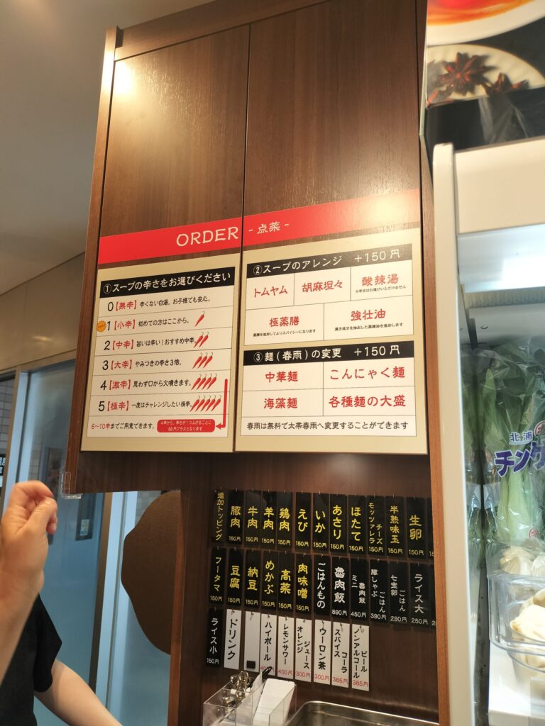 続いて、ショーケース奥にスタッフさんがいるので、有料の追加トッピング、スープの辛さ、アレンジ、麺の種類を選びます。