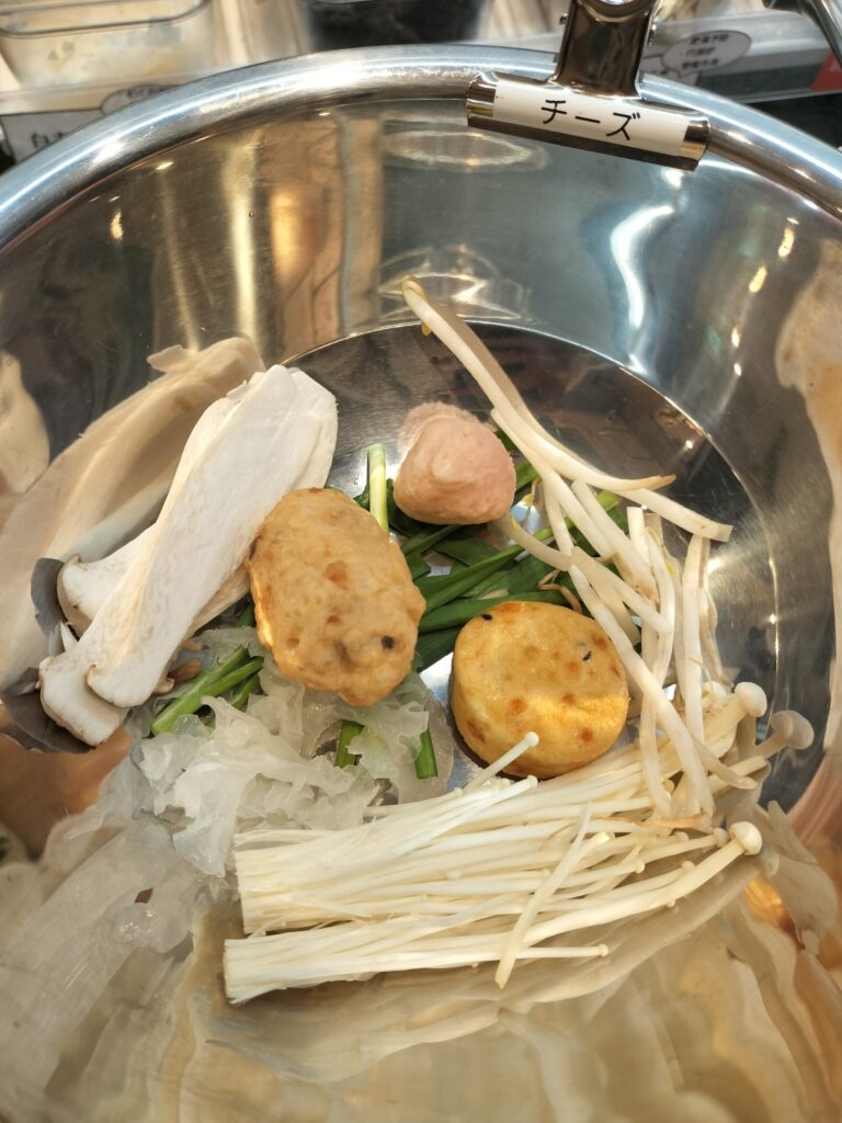 トッピングはニラ、もやし、えのき、白きくらげ、がんもどき、エビ団子、エリンギ、軟骨入りつくね、そしてLINE友達追加特典のモッツァレラチーズ!!