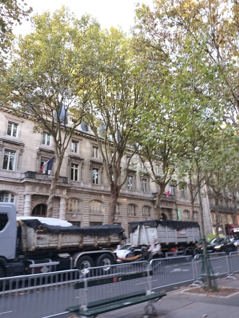 左側は大きな街路樹。建物からはフランス国旗が掲げられている。イメージ通りのパリの街並みにわくわくしてしまいます。