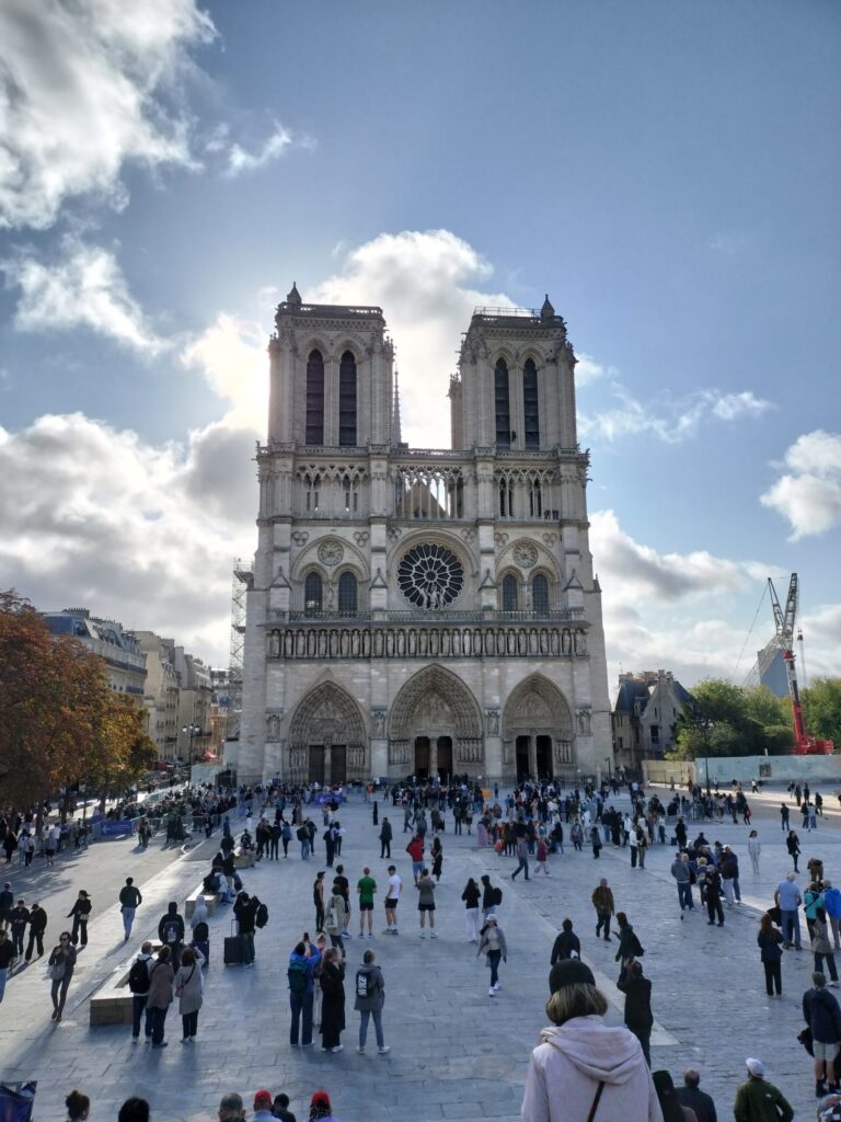 2019年4月に火災があり、尖塔と屋根が焼失してしまったノートルダム大聖堂。5年という超スピードで再建し、2024年12月から一般公開が始まっています。今回、私たちは中に入らず(事前にチケットを取らなかった)外観だけを楽しみました。多くの人が訪れていて、再建後も人気の高さを感じます。写真奥はまだ工事中で、内部の詳細修復と周辺工事が2026年まで続くようです。