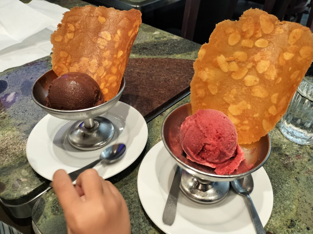 左はチョコレート、右はチェリーのシャーベット。どちらも驚くほど濃厚で、素材の味がしっかり感じられました。甘さだけで押してこない、大人も子供も満足できる美味しさです。