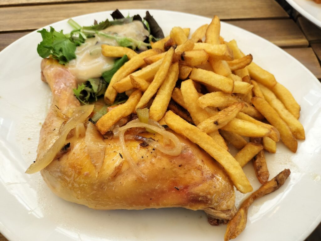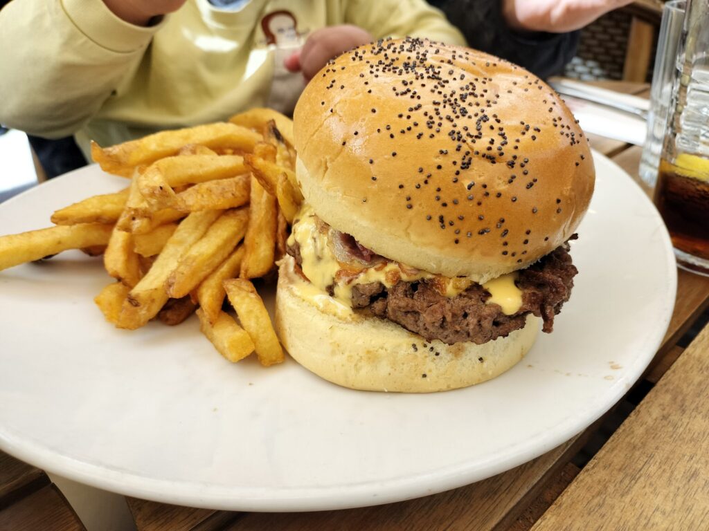 パリらしく歩道に面したテラス席があり、周囲はガヤガヤとした賑わい。「日本って、飲み会でもない限り、こんなに大きな声でおしゃべりしながら食事しないよね」なんて夫と話しながら、文化の違いを肌で感じつつ、山盛りのポテトを頬張ります。接客は感じがよく、味もまずまず。キッズメニューは見当たりませんでしたが、大人用をシェアしてちょうどいい量でした。ボリュームがあるので、子ども連れにはむしろありがたいかもしれません。