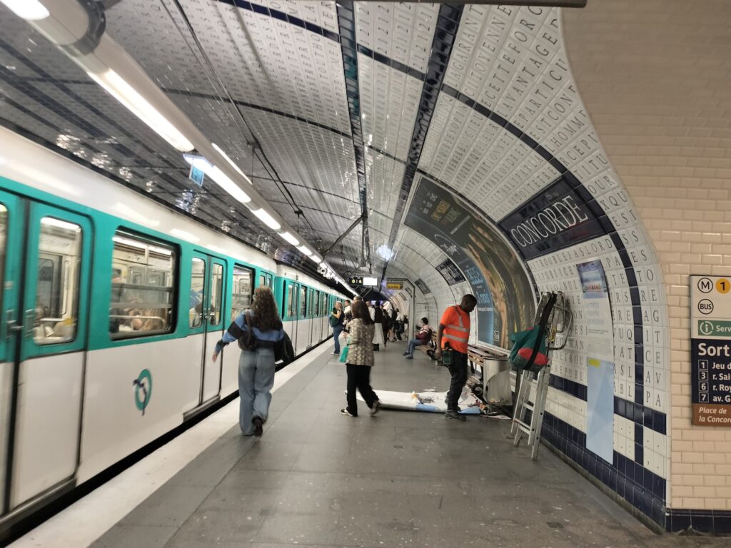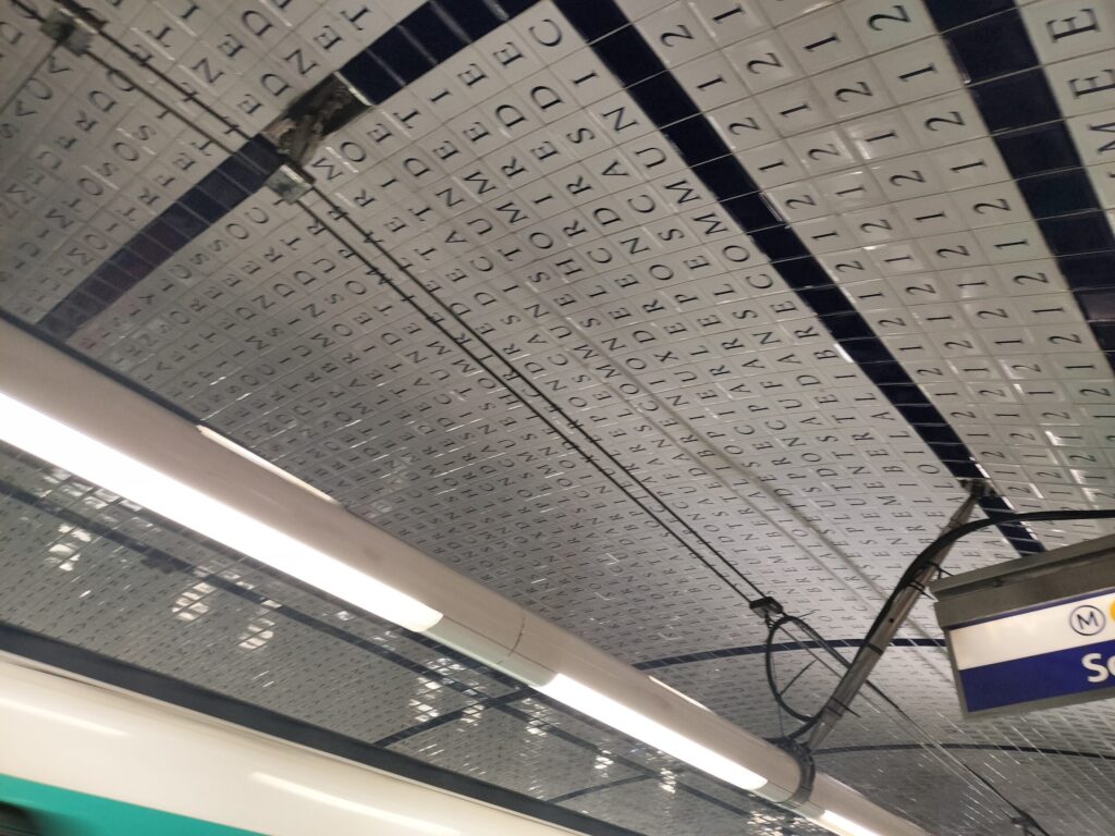パリの地下鉄は「暗い」「あまり綺麗ではない」「治安が心配」といった話をよく聞いていましたが、Concorde駅は想像と違ってとてもお洒落でした。天井までびっしりとアルファベットや数字のタイルが貼られていて、他の駅とはまったく違う雰囲気。思わず立ち止まって眺めてしまいます。