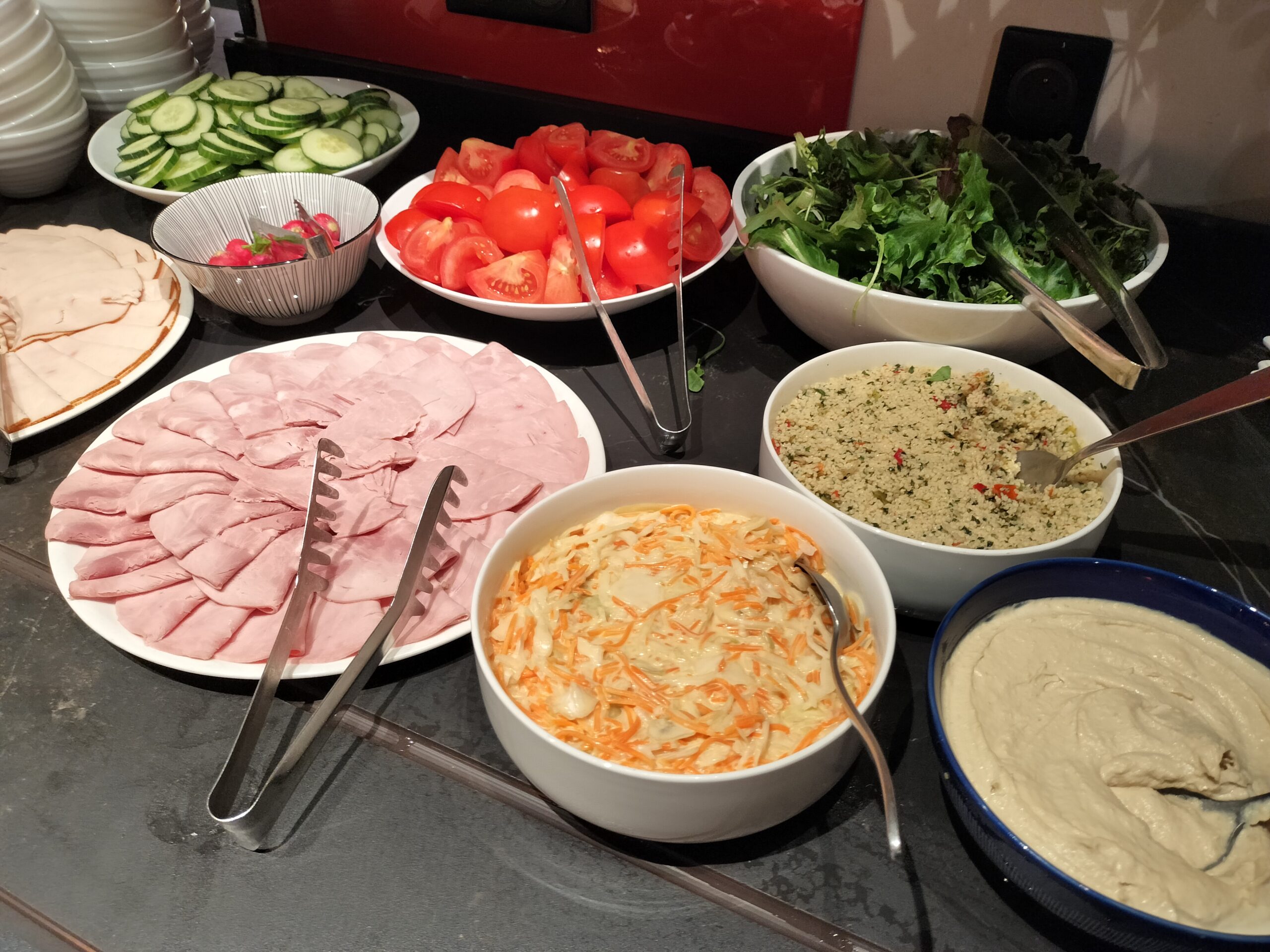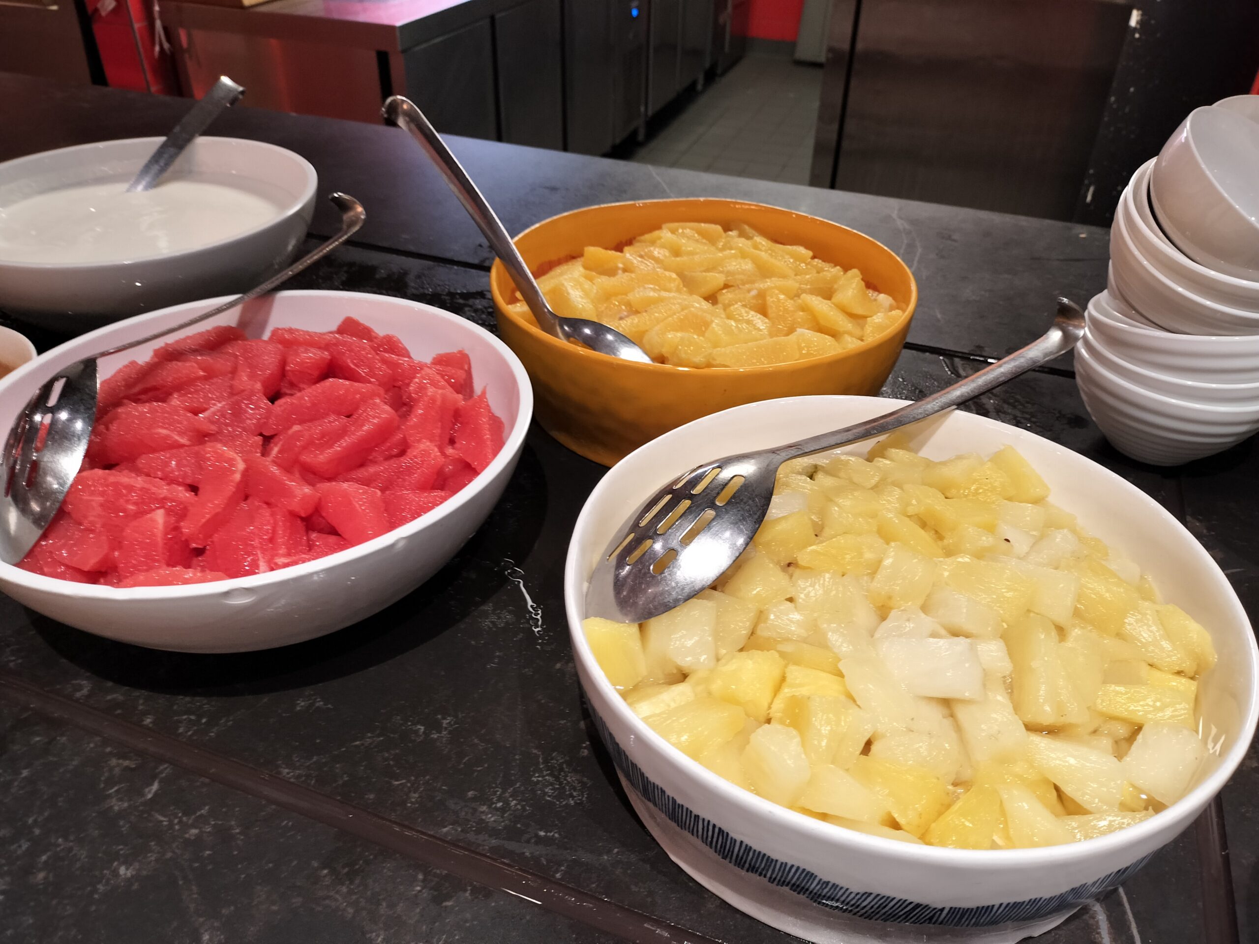 サラダ、温菜、フルーツ、コーンフレーク、ヨーグルト、チーズにパン。クロワッサンだけでなく、パン・オ・ショコラやフランスパン、キャロットケーキのようなものまで。フランスパンは自分で好きなサイズをカットできるようにまな板と包丁が置いてありました。