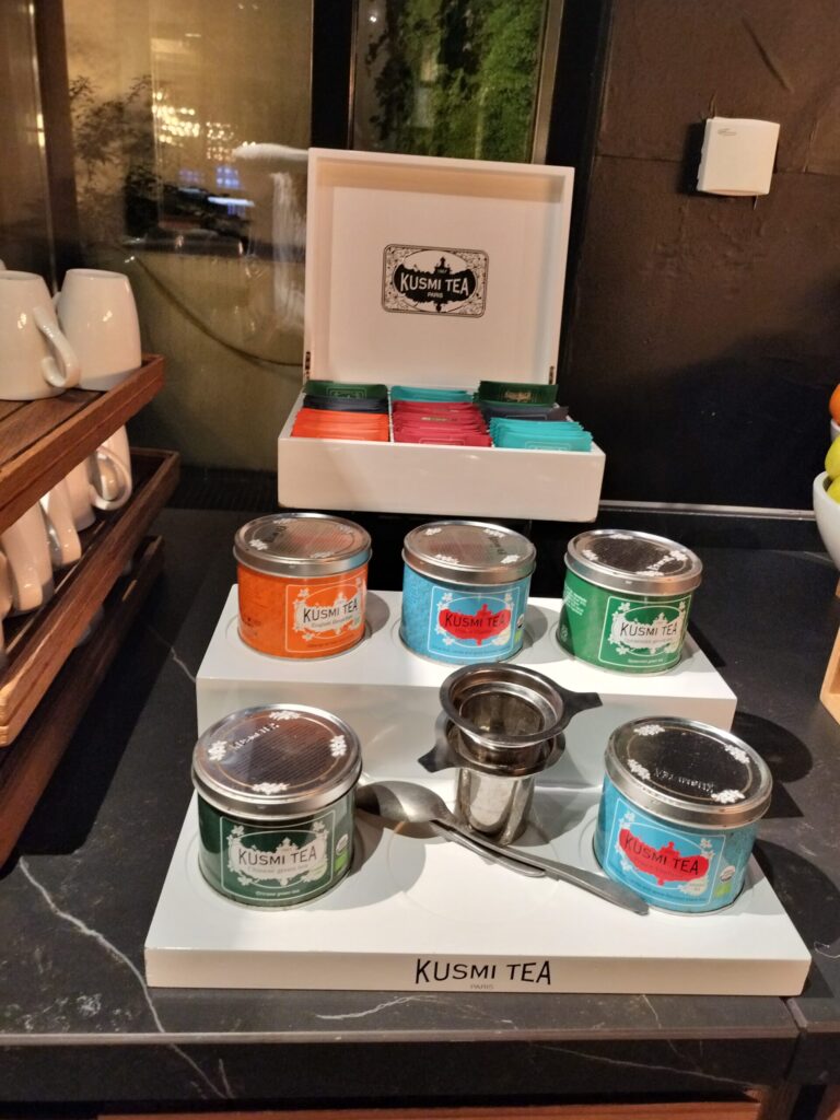 ドリンクはジュースが3種類ある他、コーヒーマシンがあり、カプチーノ、エスプレッソやホットチョコレートを楽しめます。さらに、フランスで150年以上の歴史を持つ「KUSMI TEA」も!パッケージがカラフルでかわいい(^^)