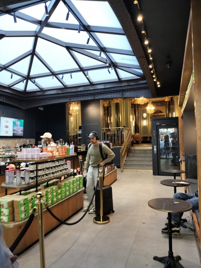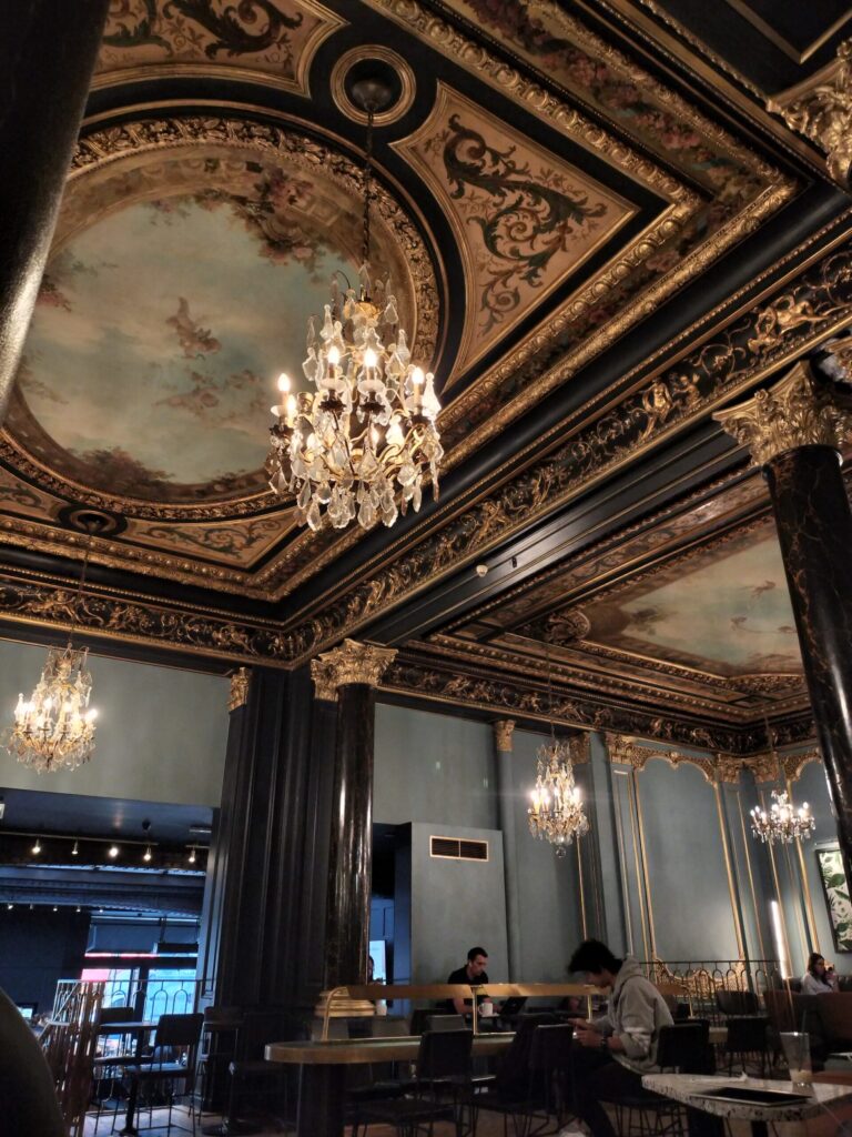 高い天井には繊細な装飾と天井画、いくつものシャンデリアが光を放っています!クラシック音楽が似合うような、“宮殿のような空間”が広がっていました。世界一綺麗なスターバックスと呼ぶ人がいるのも納得の素敵な内装でした。