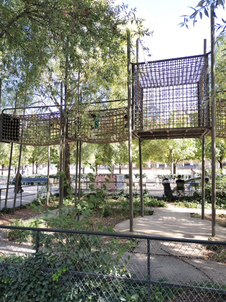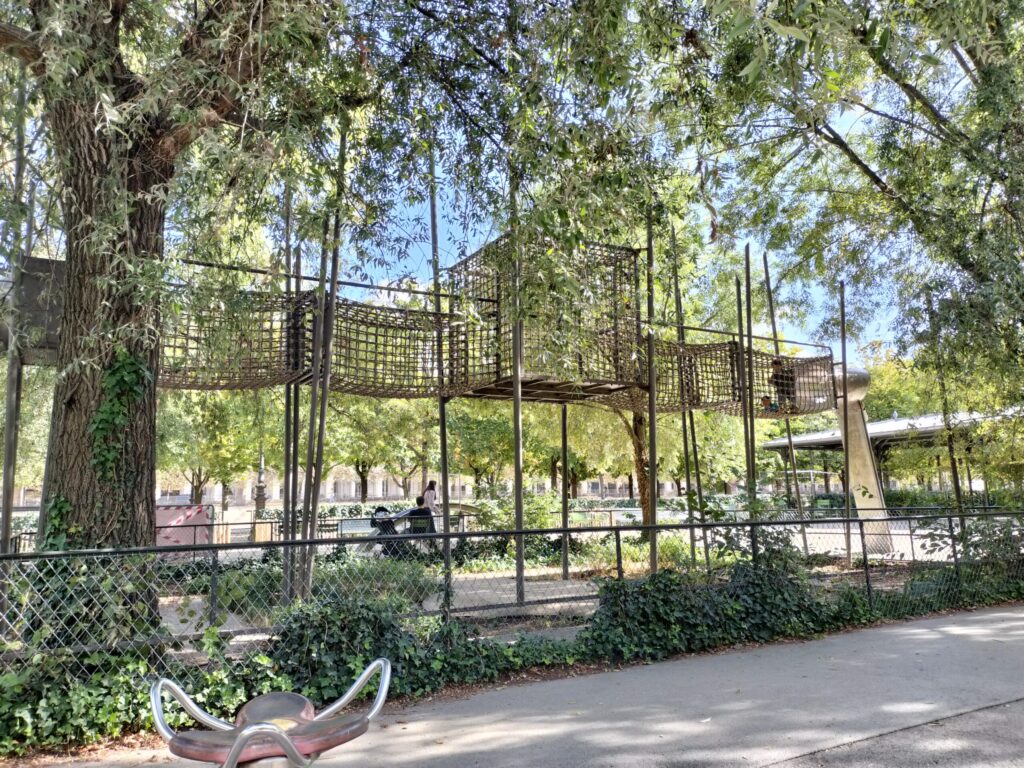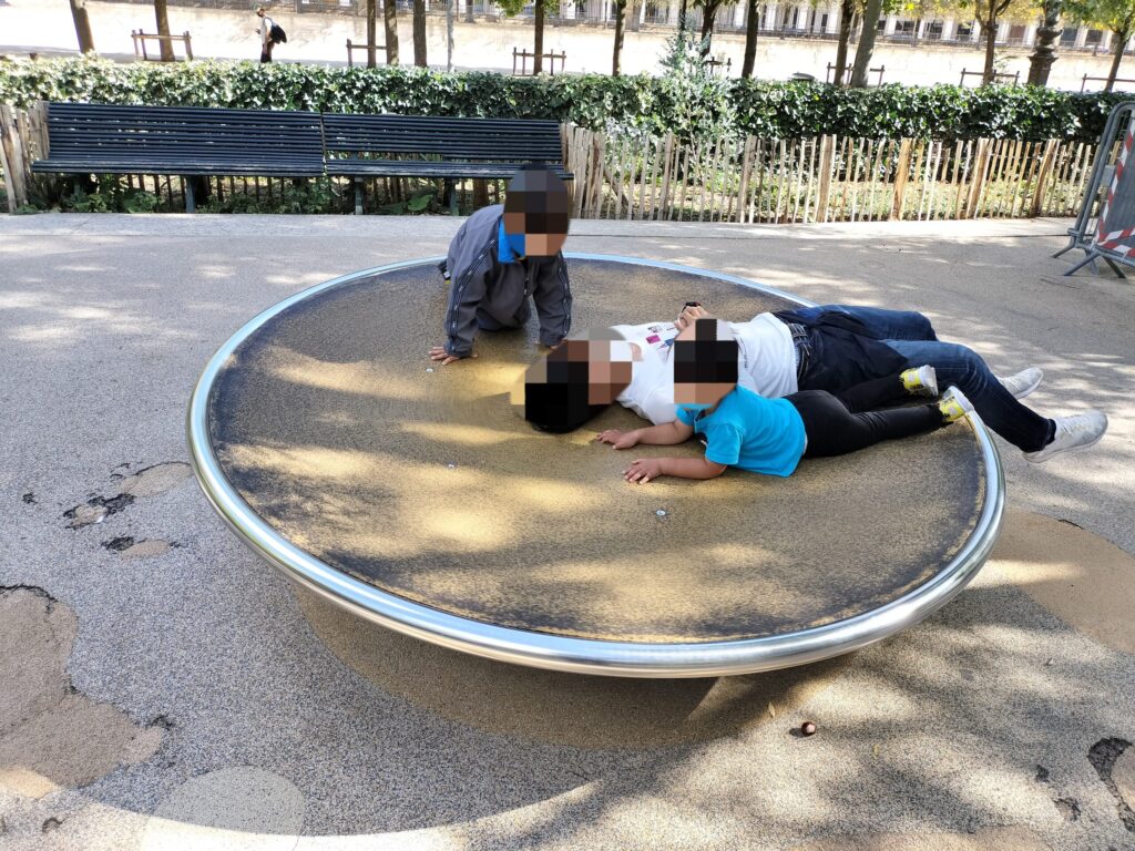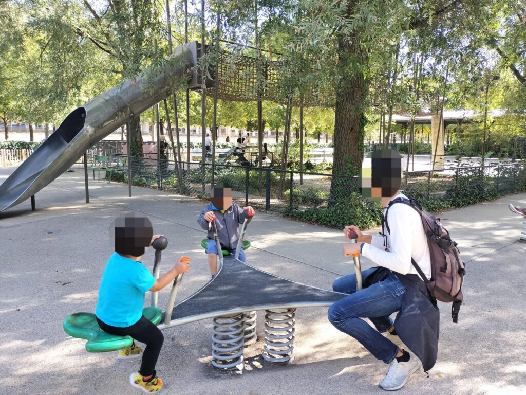 メリーゴーランドですっかり機嫌が良くなった子供たちは続いて、すぐ近くにあったの遊具で遊び始めます。遊具があるスペースには簡易な扉で設置されていて、中にいる子供たちが走って飛び出さないようになっていました。フランスでいくつか公園に行きましたが、どこも同じようになっていて、安心感がありました。