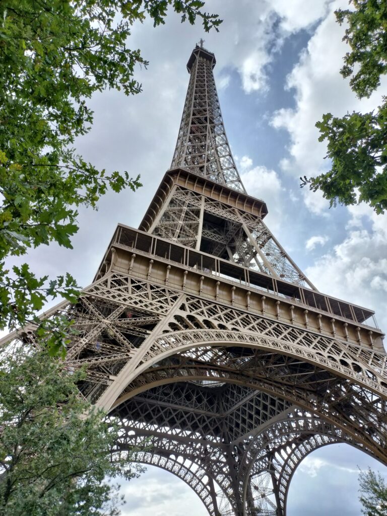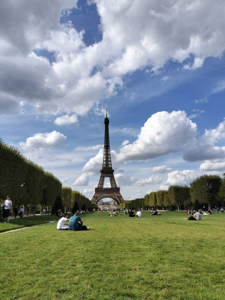 シャン・ド・マルス公園から見るエッフェル塔も素晴らしかった!青い空と芝生と木々のグリーンに溶け込むエッフェル塔。