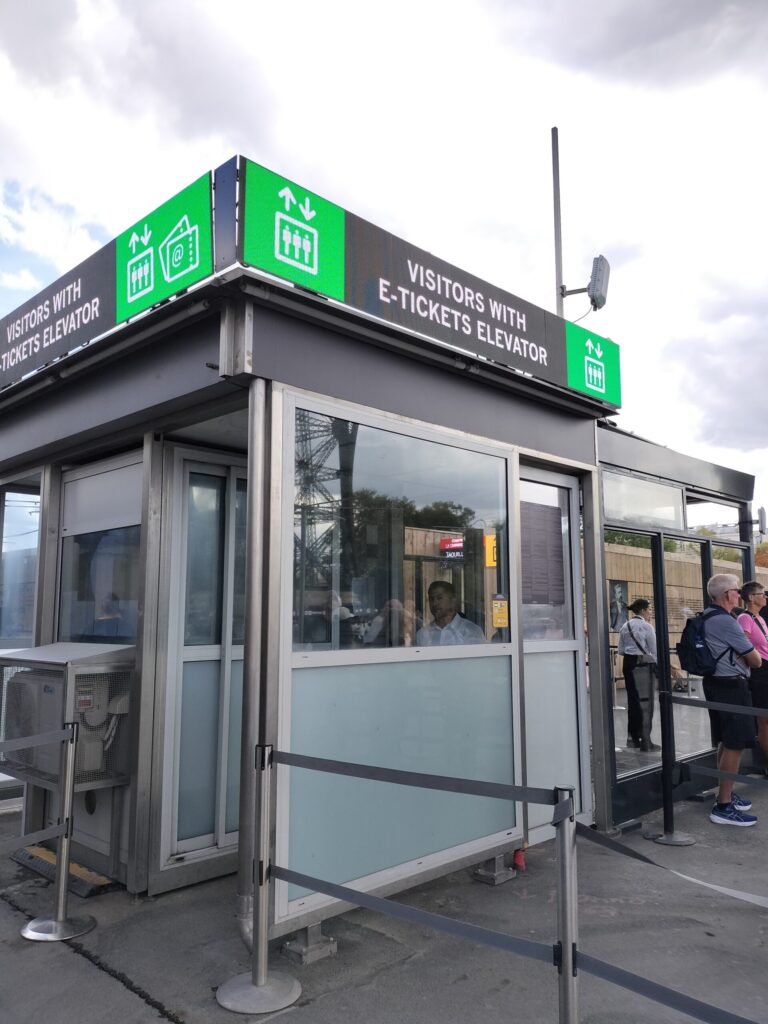 エレベーター乗り場に入る前に、チケット確認がありました。予約メールに添付されていたPDFをダウンロードしておいたので、QRコードを見せるだけ。