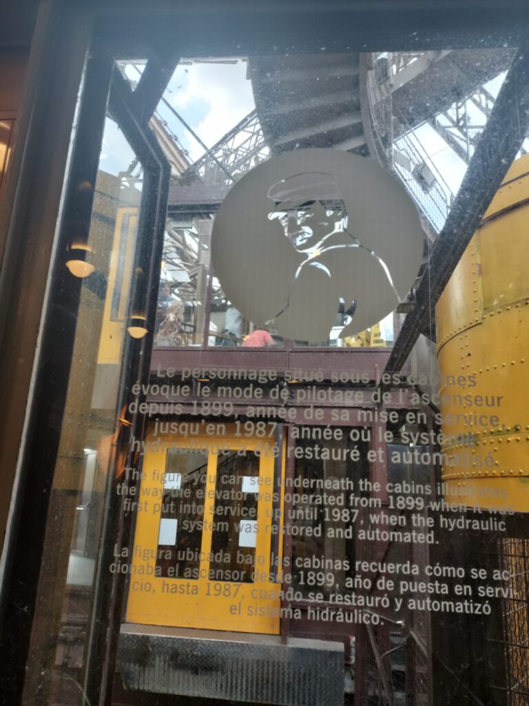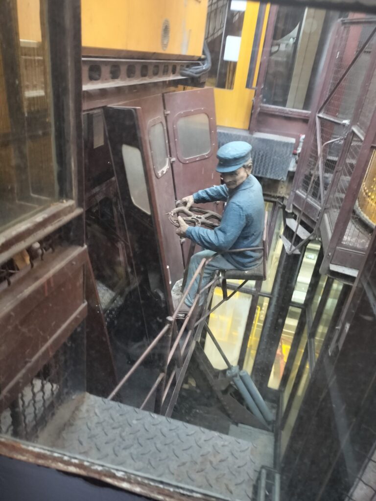 AIに翻訳してもらうと「キャビンの下に見える人物は、エレベーターが1899年に運転を開始してから、1987年に油圧システムが修復・自動化されるまでの操作方法を示しています。」と書かれていることが判明。