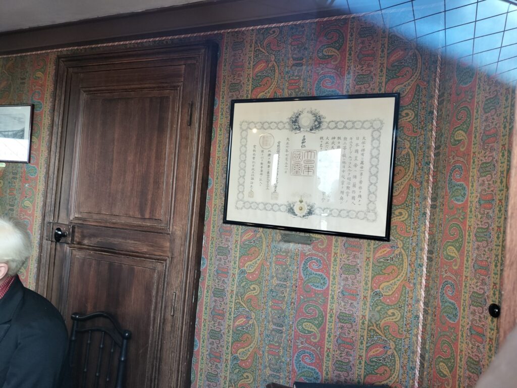 もう一つ気になったのは、日本語で書かれた賞状が飾られていたこと。写真を拡大すると、「大正六年(1917年)7月31日、、「明治勲章」 、「勲三等」と言葉が見えました。こちらもChatGPTに聞いてみると、ギュスターヴ・エッフェルは日本政府から「勲三等旭日章(Order of the Rising Sun, Gold Rays with Neck Ribbon)」を授与された人物で、その授与証書(勲記)の現物またはレプリカだそう。