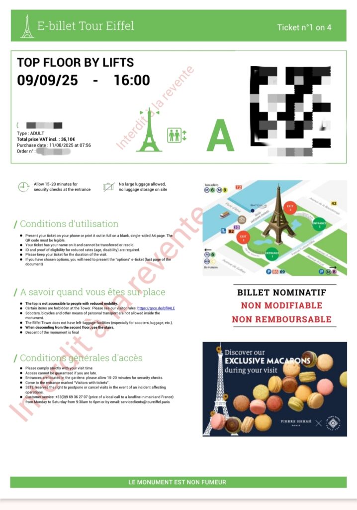 エッフェル塔の入場チケットは公式サイトから事前予約をしました。登る日の1ヶ月半前に予約すれば余裕だろうとのんびりしていたら、「最上階まで」も「2階までエレベーター」のチケットもすでに完売(泣)