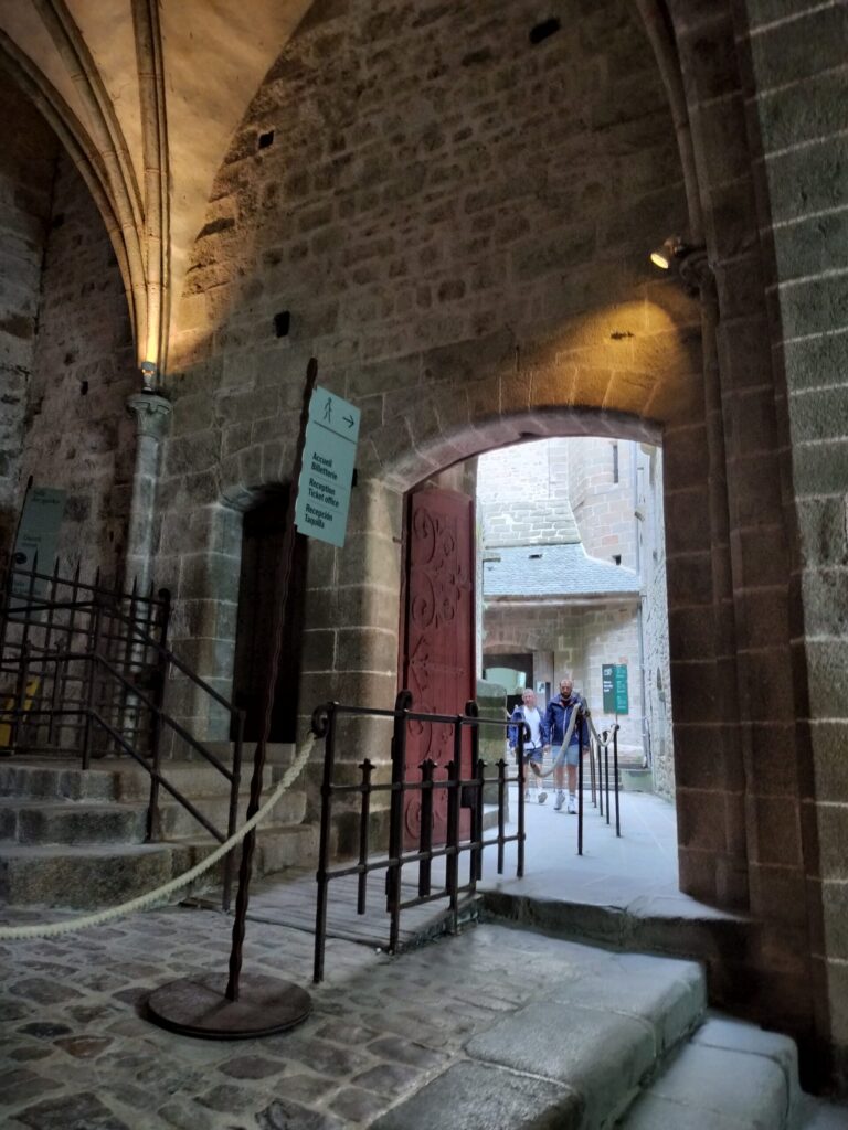 フランス国旗がはためいているだけで、一気に雰囲気が締まってカッコいい。入口に着くと、左手には1〜2ユーロの有料トイレ。そして右側に見える石造りのアーチ状の門をくぐった瞬間——いよいよ“モン・サン・ミッシェルの世界”に突入、という感じでテンションが一気に上がる。