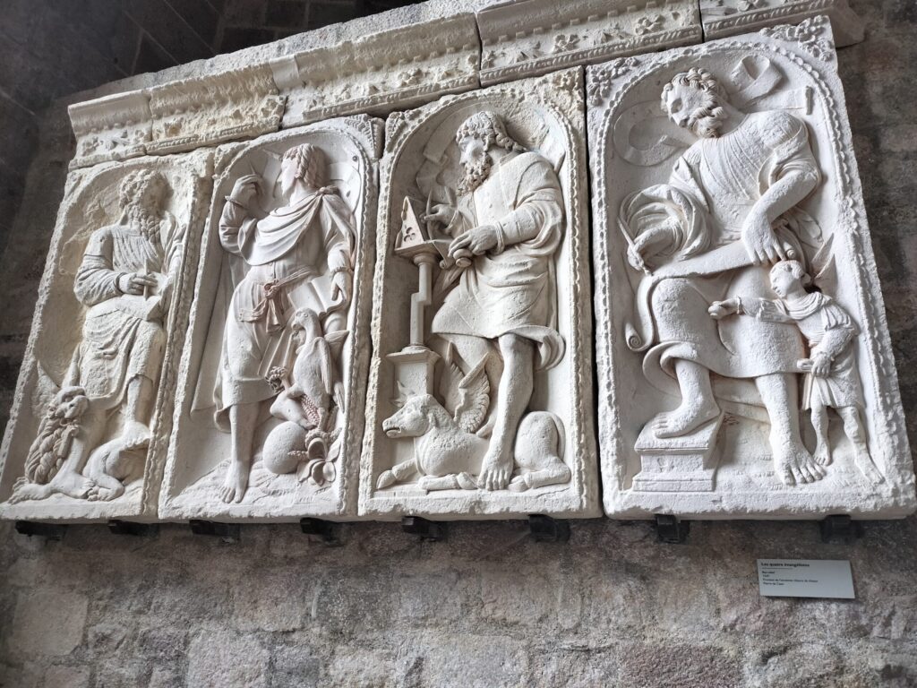解説によると、昔の絵や彫刻では誰が誰だか分かるように、決まったシンボルと一緒に描くルールがあったそうです。この「4人の福音書記者」にもそれぞれのシンボルが描かれています。