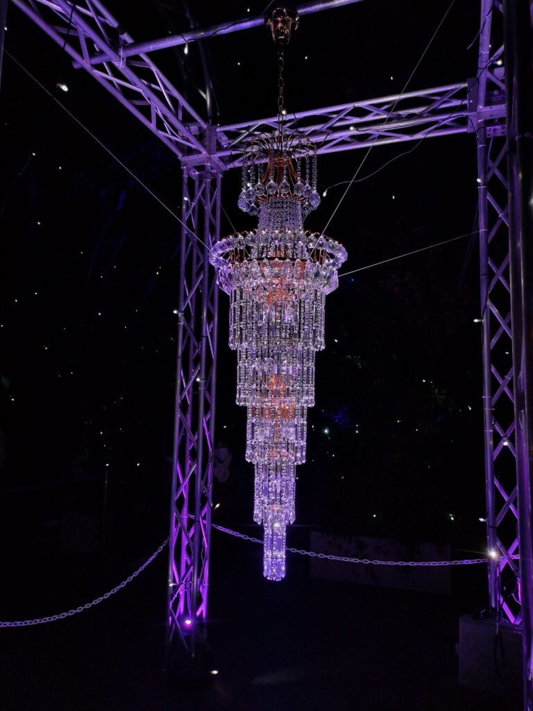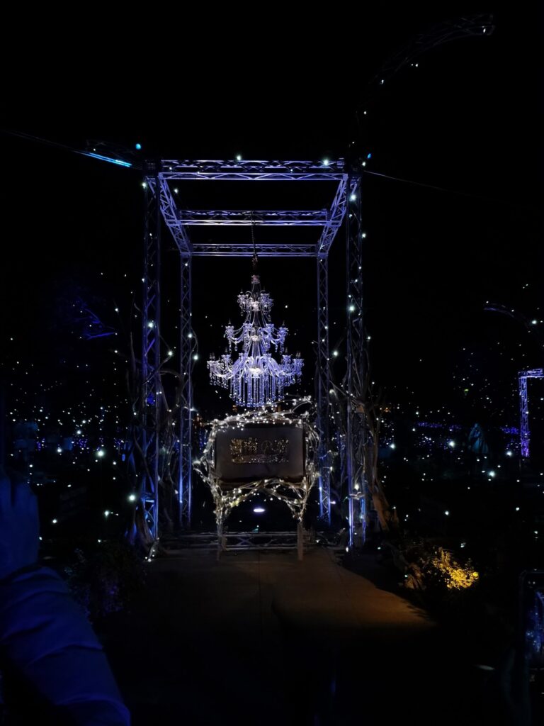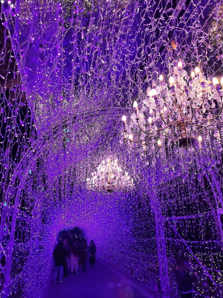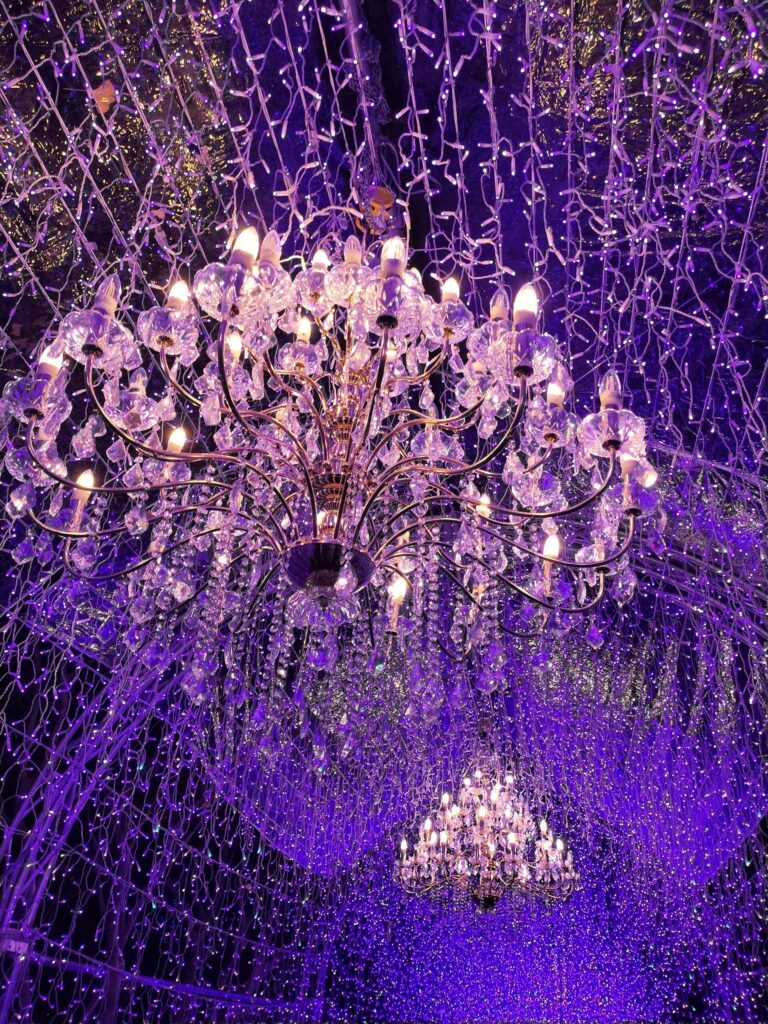 光のトンネルを抜けるだけでも十分に美しいのに、頭上には大きなシャンデリアが輝きを変えながら浮かび、視界いっぱいに光の粒を散りばめています。