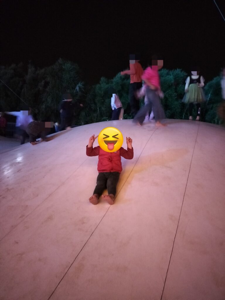 これまではふわふわドームのすぐ手前で靴を脱いでから上がれたので、白いドームはそこまで砂が付かず快適でした。ところが今回は靴を脱ぐ位置がもっと前方に変わっていて、砂場を通らないとドームまで行けない動線になっていました。